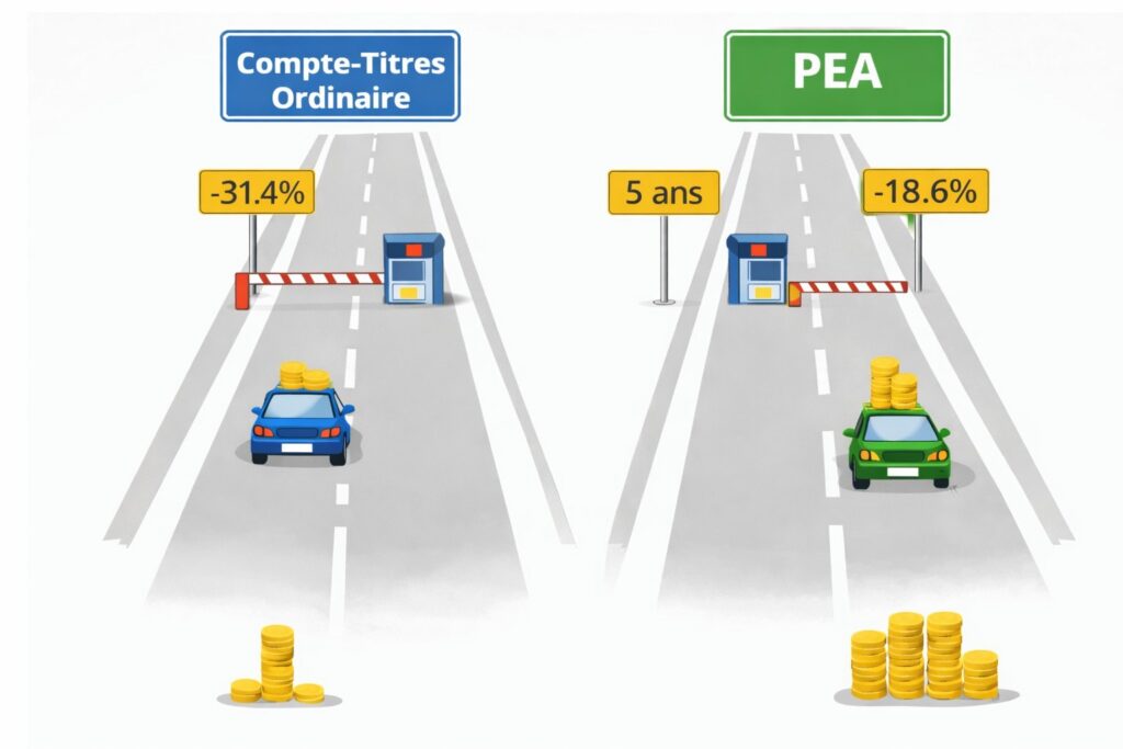 Imaginez deux autoroutes sur lesquelles vous faites rouler vos investissements boursiers. Sur la première (le compte-titres ordinaire), vous passez à chaque sortie par un péage qui vous prend 31,4% des kilomètres parcourus. Sur la seconde (le PEA), vous roulez librement, sans aucun péage tant que vous restez sur la route. Et quand vous décidez de sortir après 5 ans, le péage ne vous prend que 18,6% des kilomètres parcourus. Sur une vie d’investisseur, cette différence de péage, ce sont des milliers d’euros qui restent dans votre poche.