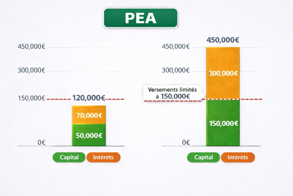 Prenons un exemple concret. Vous versez 50 000 € sur dix ans. Grâce à la hausse des marchés, votre portefeuille vaut maintenant 120 000 €. Vous avez gagné 70 000 €. Aucun problème : votre PEA peut valoir 200 000 €, 500 000 € ou même 1 million d’euros. Seuls vos versements sont limités à 150 000 €, pas vos gains.