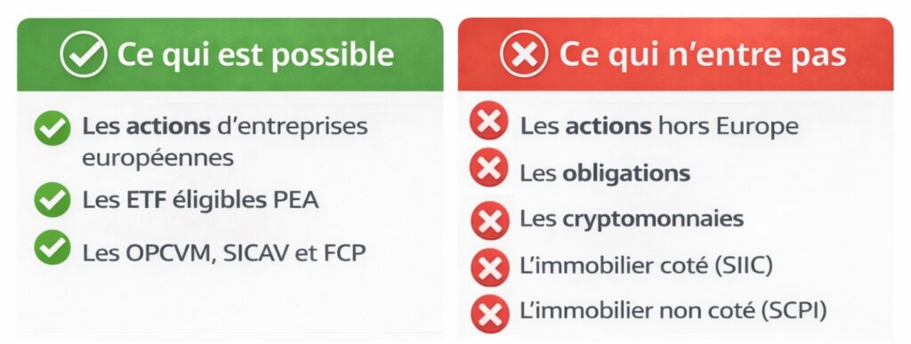 Le PEA n’accepte pas tous les investissements. L’État a fixé des règles sur ce qui peut entrer dans l’enveloppe. Ces contraintes peuvent sembler limitantes, mais des solutions existent pour les contourner légalement.